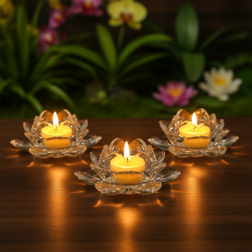 The design beautifully complements the warm glow of the candles, making them a perfect addition to any tabletop seeking a touch of nature and spirituality.Premium Resin Construction: Made from durable, high-grade resin that allows for intricate detailing in the petals and leaves, ensuring the piece is sturdy and long-lasting compared to fragile materials.Intricate Lotus Design: Each holder features a realistic lotus shape with textured petals that symbolize purity and serenity, adding an artistic and Zen-like quality to your décor.Warm Ambiance: The central cup is perfectly sized to hold standard candles, allowing the flame to dance within the petals and cast a soft, inviting light across your table.Elegant Set of Three: The set includes three matching lotus holders, creating a balanced and symmetrical look when arranged together on a dining table, mantle, or shelf.Versatile Home Accent: The neutral and elegant finish allows these holders to blend seamlessly with various interior styles, from modern minimalist to classic bohemian.