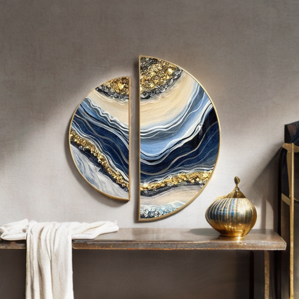 This duo of semi-circular (arch) panels captures the fluid beauty of the ocean and the sky through the medium of high-gloss resin. The intricate interplay of deep azure blues, soft creamy whites, and luxurious gold leaf creates a sense of depth and movement that changes with the light. Perfectly suited for contemporary interiors, these pieces act as a sophisticated visual anchor above a sofa, console table, or bed.Fluid Resin Artistry: Each piece is hand-poured using premium resin, creating unique, organic patterns that mimic ocean waves or clouds, ensuring no two pieces are exactly alike.Luxurious Color Palette: The blend of rich blue, neutral beige, and shimmering gold adds a touch of opulence and tranquility to any room color scheme.Modern Arch Shape: The trendy semi-circular (half-moon) design offers a soft yet geometric aesthetic that complements modern minimalist and Scandi-style interiors.High-Gloss Finish: The resin provides a glass-like, glossy sheen that reflects light, making the artwork feel vibrant and alive throughout the day.Ready to Style: This set of two is designed to be hung together or separately, offering versatile decor options for your living room, hallway, or office.