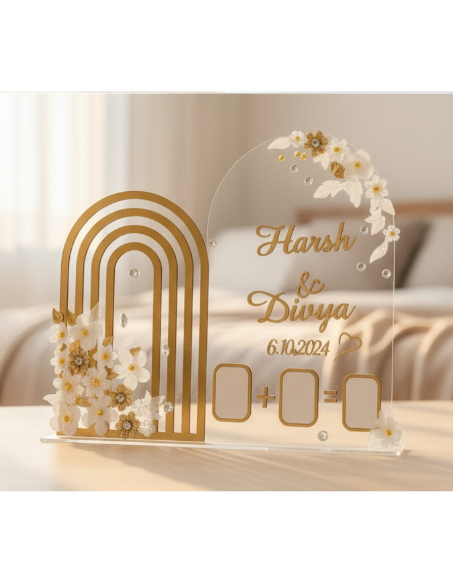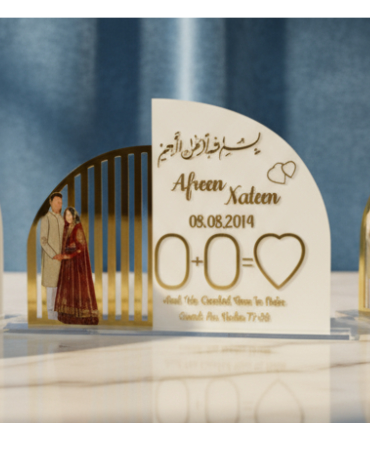 Capture the magic of your wedding day with the Eternal Union Personalized Acrylic Wedding Arch. This exquisite decor piece is designed to be the highlight of your reception or ceremony table, beautifully displaying the couple's unique love story. Crafted from high-quality acrylic, the board features a clean, modern semi-arc shape that adds a touch of sophistication to any venue, from intimate gatherings to grand celebrations. The custom printing allows you to showcase names, the special date, and romantic equations or Arabic calligraphy, creating a bespoke keepsake that honors your heritage and commitment.Fully Customizable Design: Personalize the board with the couple's names, wedding date, and meaningful text (such as "0 + 0 = ♥" or Arabic prayers) to make the event uniquely yours.Premium Acrylic Material: Made from durable, smooth acrylic that offers a glass-like finish while being lightweight and sturdy, ensuring it lasts as a cherished memento long after the event.Modern Arch Shape: The trendy semi-circular (half-moon) silhouette provides a contemporary aesthetic that fits perfectly with modern, bohemian, or traditional wedding themes.Versatile Table Decor: Ideally sized to sit on the main sweetheart table, guest book table, or gift table, adding a personalized touch to your setup.Elegant White Finish: The crisp white background makes the gold or black text pop, ensuring high visibility and a luxurious look that photographs beautifully.